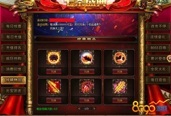 【活动说明】:每消费1000000元宝,即可兑换1个极品道具!兑换无上限!