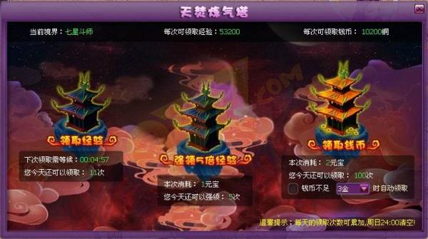 每天的领取次数都可以累积,在周日的凌晨00:00清空。斗破苍穹2天焚炼气塔中还有超级方便的自动领取功能,只要玩家设定背包中钱币下限,一旦不足指定金额时,系统将会从天焚塔中自动领取,非常方便。