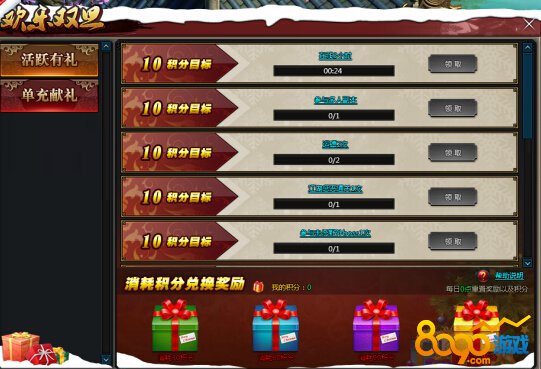 活动期间,玩家达到对应活跃的要求,可活动对应积分,积分越多奖励越丰富。
