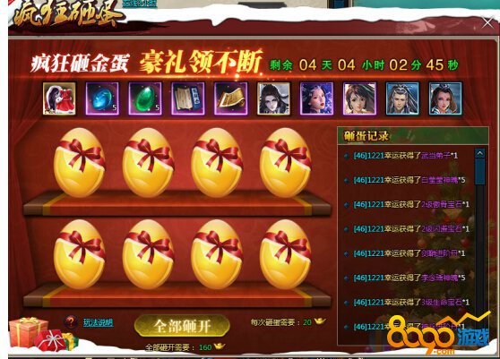活动期间内,玩家每日都可参与疯狂砸蛋活动,每日没有次数限制。每次砸蛋需消耗20元宝,活动中的金蛋全部砸光后,可刷出新的金蛋进行新一轮的砸蛋活动。