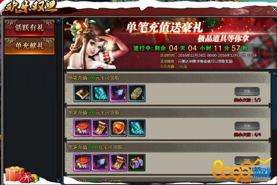 7. 单笔充值5000元:橙色名录*1、高级保护符*5、随机成长丹*3、绑定元宝*400;