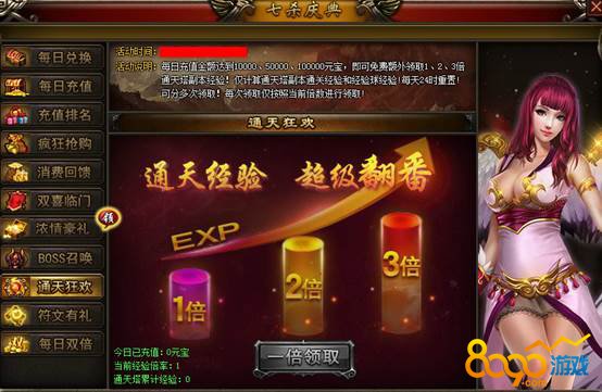 【活动说明】:每日充值金额达到10000、50000、100000元宝,即可免费额外领取1、2、3倍通天塔副本经验!仅计算通天塔副本通关经验和经验球经验!每天24时重置!可分多次领取!每天领取仅按照当前倍数进行领取!