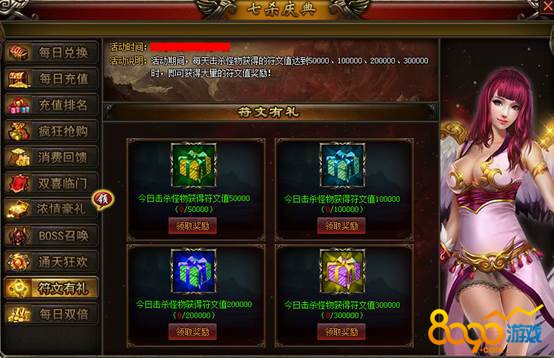 【活动说明】:活动期间,每天击杀怪物获得的符文值达到50000、100000、200000、300000时,即可获得大量的符文值奖励!