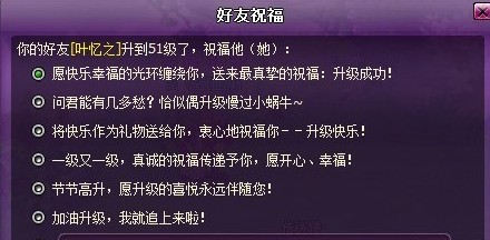 全新好友祝福系统华丽登场,玩家达到20级时每升一级,其好友都会收到系统的祝福提示,并可以通过此特殊图标送去你最衷心的祝福哦~玩家可以选择系统设定的祝福语句或者自己输入想要说的话~送上的是温暖与祝福,当然更有珍贵的好友度哦~祝福抢先送更有特别的惊喜等着你哦!前十位发送祝福的玩家将会获得经验奖励和好友度+2,看看谁才是时时刻刻关注你的人!