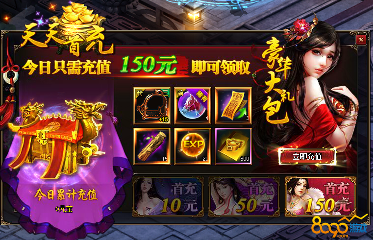 【活动内容】每日只需充值10元、50元、150元即可领取相应档次豪华大礼包!天天充值,天天有惊喜好礼等您来拿~