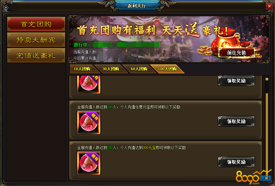 一重奏:首充团购,开服期间,全服累计首充人次达成后,所有玩家可以领取好礼,充值玩家领取更多档次奖励