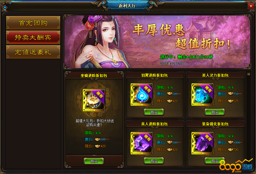 活动三:返利大厅:首充团购、特卖大酬宾、充值送豪礼,丰厚奖励,超低折扣,开服就带你飞!