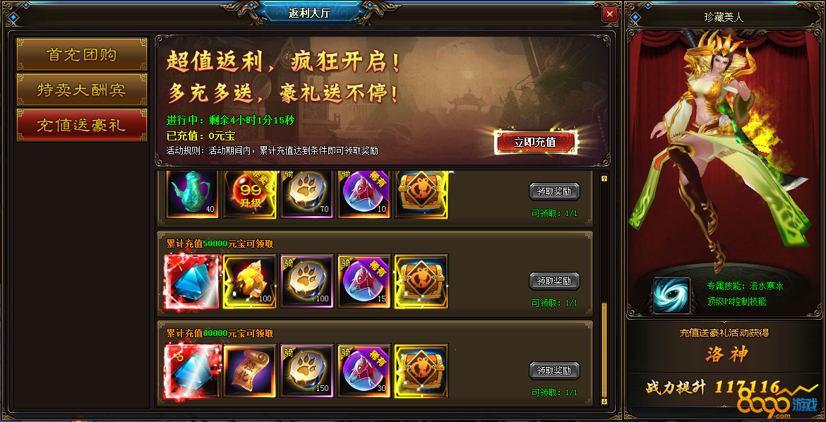 三重奏:充值送豪礼,你充值我送珍稀美人,还有高级宝石、坐骑进阶丹、珍稀技能书等极品道具等你来领