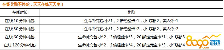 【活动内容】在线送好礼,角色累计在线一定时间,系统赠送高级道具奖励