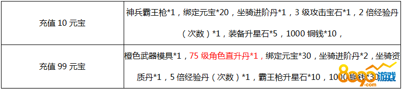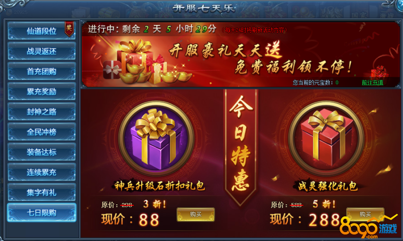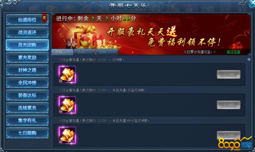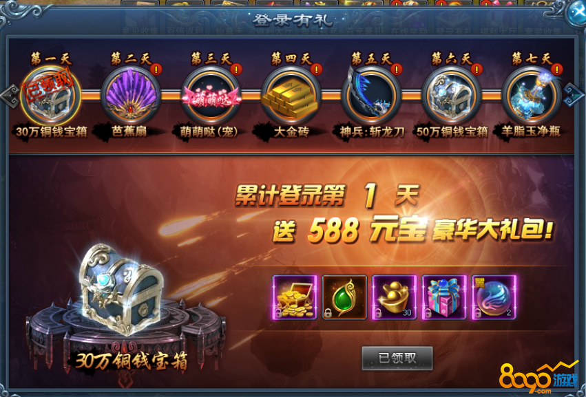① 花费888元宝,开服七天每天均可领取一份奖励。