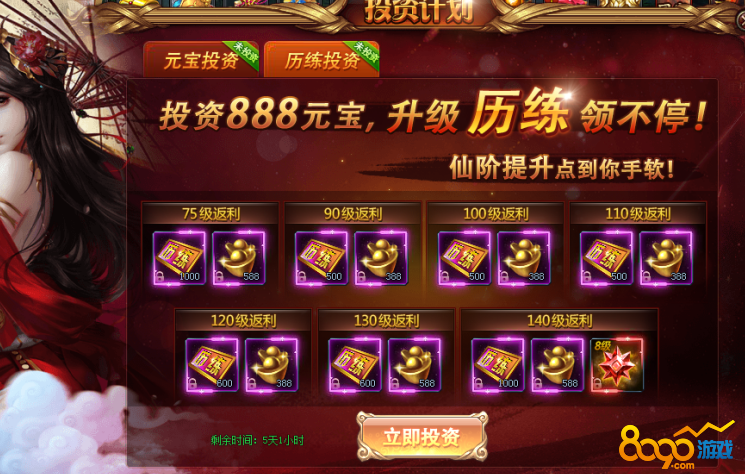 ① 花费888元宝,达到指定等级均可领取一份奖励。