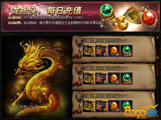【活动内容】活动期间,每日提取一定元宝即可获得相应丰厚充值奖励!