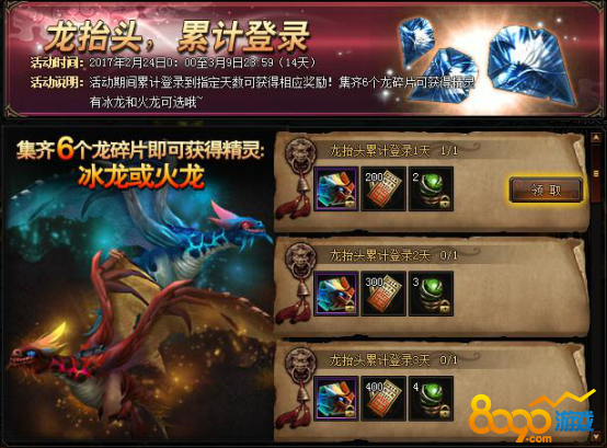 【活动内容】活动期间,累计登录达到指定天数即可获得相应奖励。集齐6个精灵龙碎片可获得精灵,冰龙、火龙等你来选~