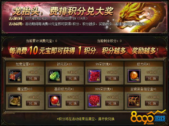 【活动内容】活动期间,每消费10元宝即可获得1积分,积分越多,奖励越多,超值大奖等你来兑换!