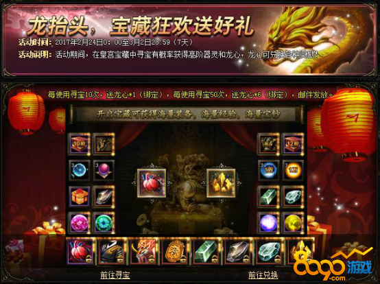 【活动内容】活动期间,在皇宫宝藏中寻宝有概率获得高阶器灵和龙心,龙心可兑换各种奖励!