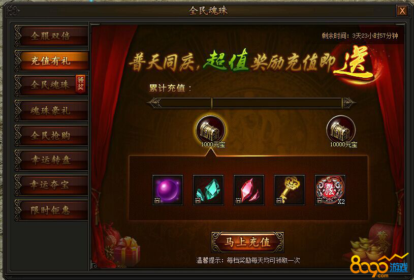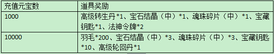 活动期间,充值元宝即可领取两档丰厚奖励,每天均可领取一次,不容错过!