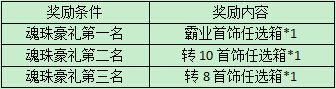 活动期间,使用魂珠碎片大、中、小材料获得魂珠碎片,获得碎片数目达到6000即可参与碎片获得排行,有机会获得霸业装备、极品首饰奖励!活动结束后,奖励通过邮件发送。