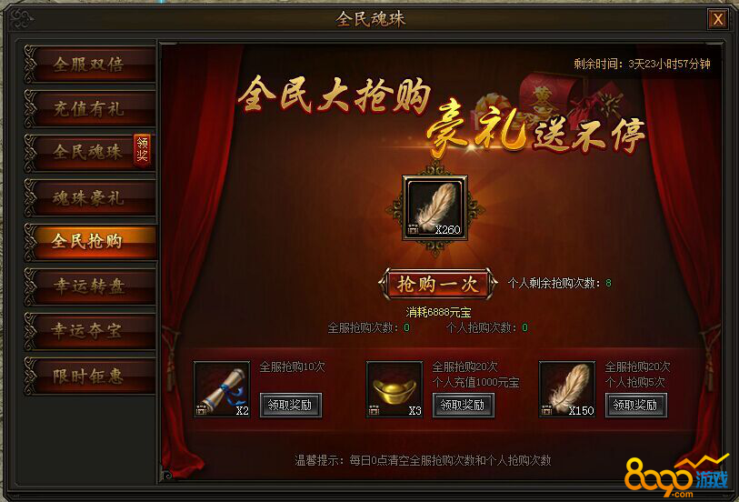 活动期间,所有玩家均可参与羽毛道具抢购,每人每天最多抢购8次,全服抢购满一定次数且个人满足对应条件,即可领取对应奖励。