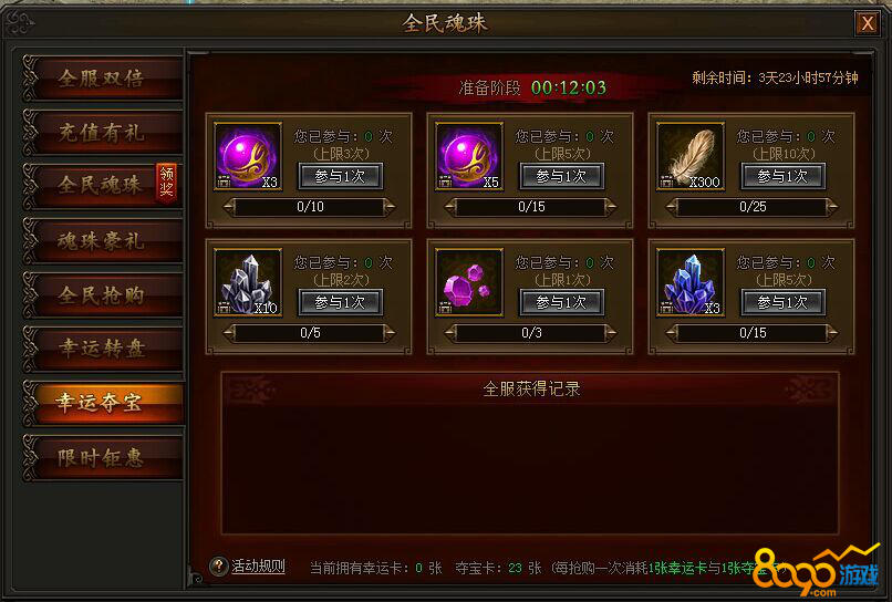 活动期间,充值和消费一定数量元宝,即可分别获得幸运卡和夺宝卡,每次参与均需消耗幸运卡和夺宝卡各1张;
