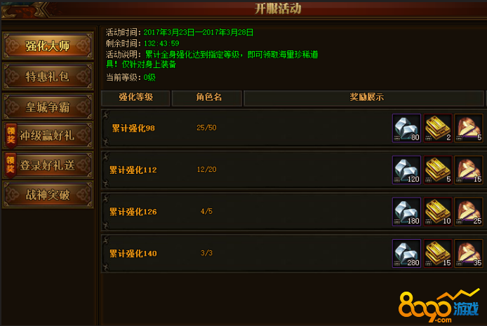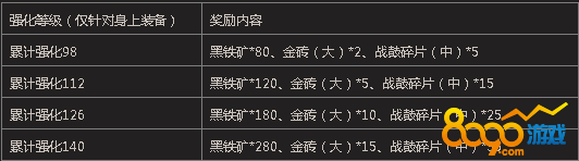 活动内容:累计全身强化达到指定等级,即可领取珍稀道具。