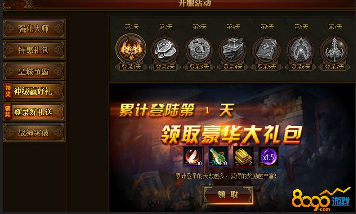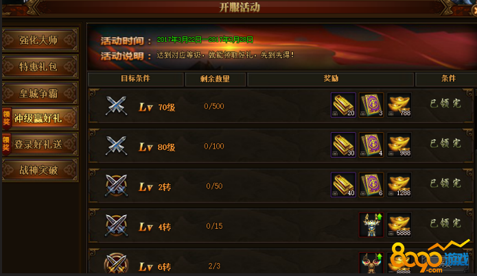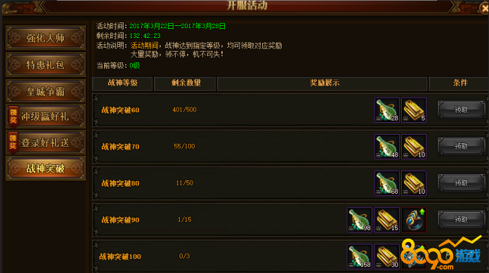 活动内容:活动期间战神达到指定等级,可领取对应奖励礼包(数量有限先到先得)。