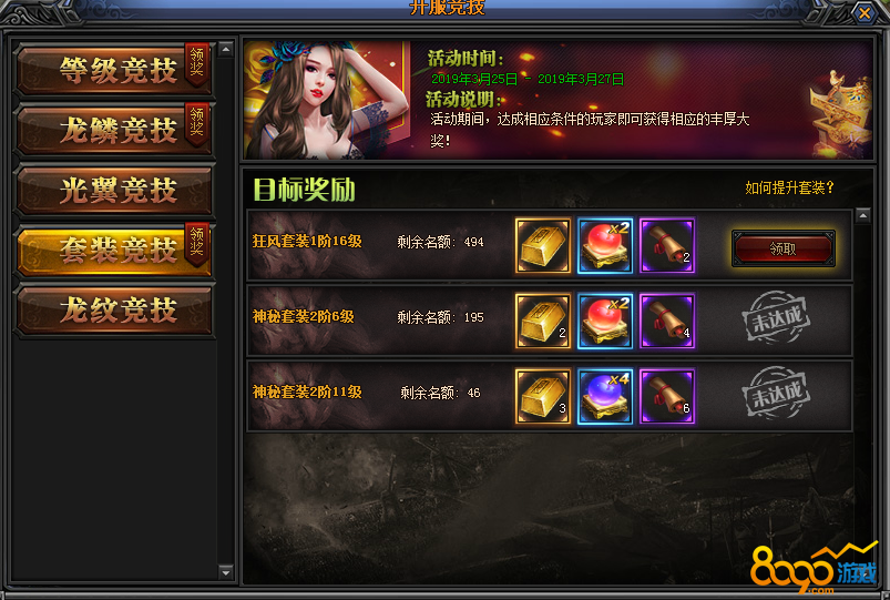 活动详情:活动期间,传奇套装等级达成相应条件的玩家即可获得相应的丰厚大奖!(开服第三天开启)