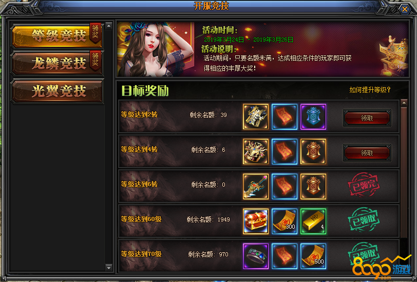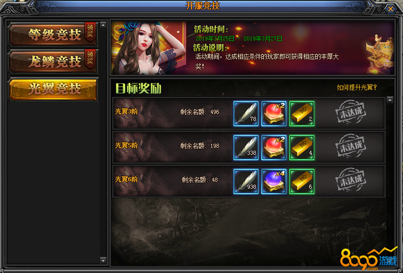 活动详情:活动期间,光翼等级达成相应条件的玩家即可获得相应的丰厚大奖!(开服第二天开启)