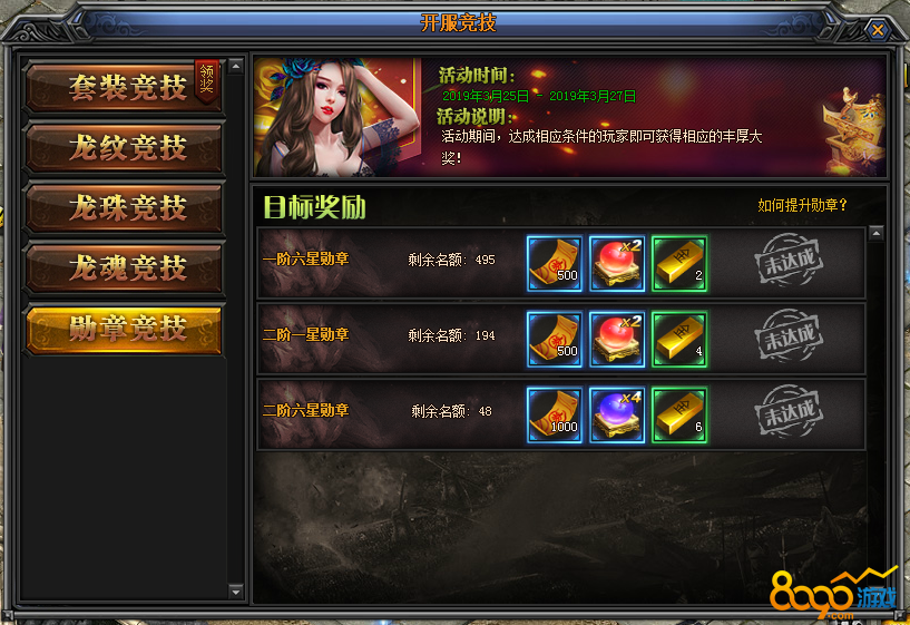 活动详情:活动期间,勋章等级达成相应条件的玩家即可获得相应的丰厚大奖!(开服第五天开启)