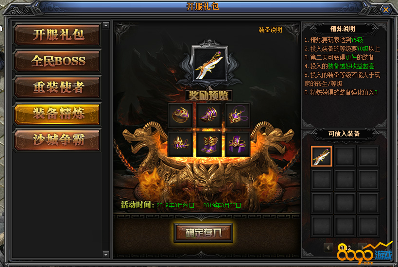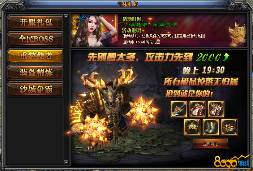 活动详情:活动期间,攻击达到2000的玩家可以随意进出该活动地图,活动中BOSS掉落无归属,可掉落大量极品装备,活动持续30分钟
