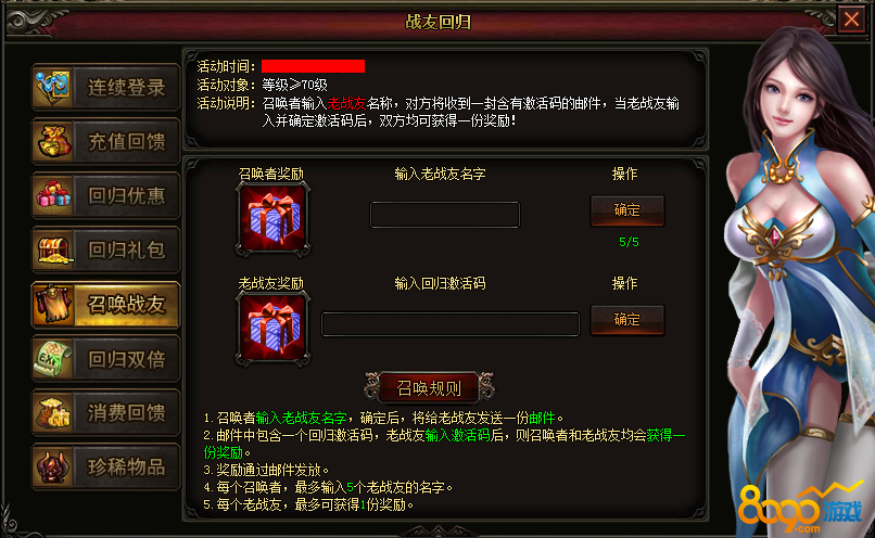 【活动说明】:召唤者输入老战友名称,对方将收到一封含有激活码的邮件,当老战友输入并确定激活码后,双方均可获得一份奖励!