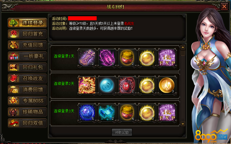 【活动对象】:等级≥70级,且5天或5天以上未登陆的老战友 【活动说明】:连续登陆天数越多,可获得越丰厚的奖励