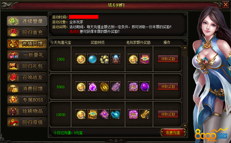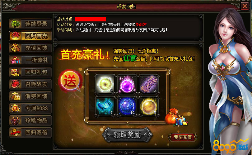【活动说明】:活动期间,充值任意金额即可领取老战友回归首充礼包!