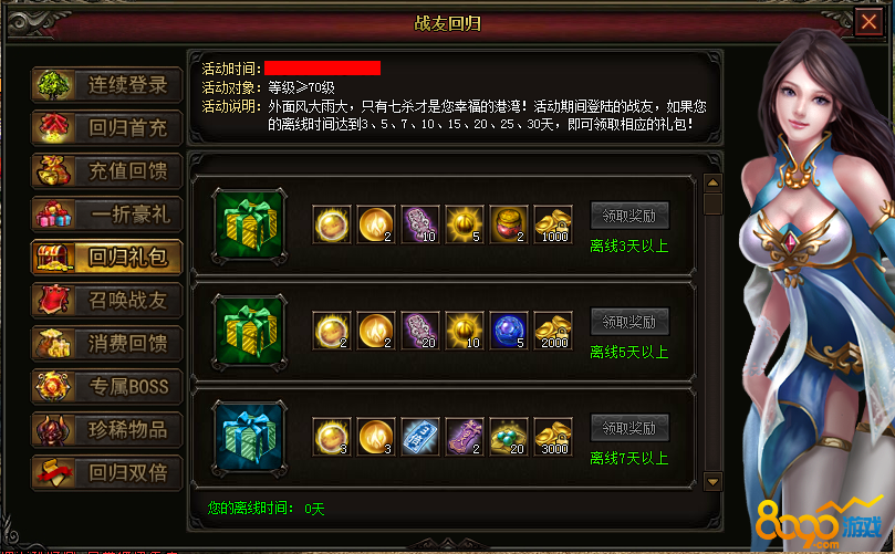 【活动说明】:外面风大雨大,只有七杀才是您的幸福港湾!活动期间登录的战友,如果您的离线时间达到3、5、7、10、15、20、25、30天,即可领取相应的礼包