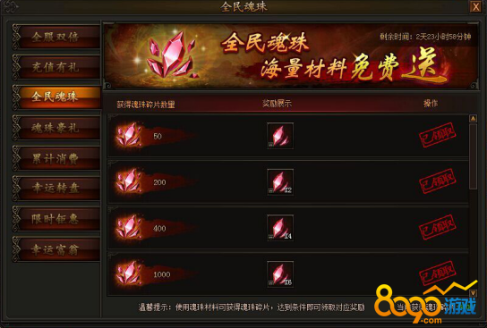 活动期间,使用魂珠碎片大、中、小材料获得魂珠碎片,获得的魂珠碎片达到一定数量即可领取大量材料返还,获得碎片越多,返还材料越多,升级魂珠事半功倍!