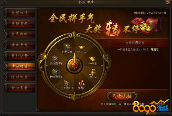 活动期间,充值并消费一定元宝即可使用幸运转盘,获得大量不绑定元宝返还,更有机会得到时装宝箱,获得珍稀时装奖励。