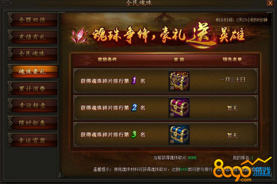 活动期间,使用魂珠碎片大、中、小材料获得魂珠碎片,获得碎片数目达到6000即可参与碎片获得排行,有机会获得霸业装备、极品首饰奖励!活动结束后,奖励通过邮件发送。