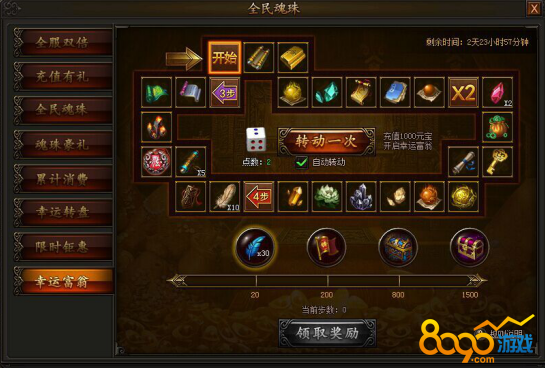 活动期间,充值一定元宝即可参与幸运大富翁,获得丢骰子次数,转动骰子即可获得踩中格子上的豪华奖励,多次参与累计步数,更有机会得到时装宝箱和极品转生装备奖励!