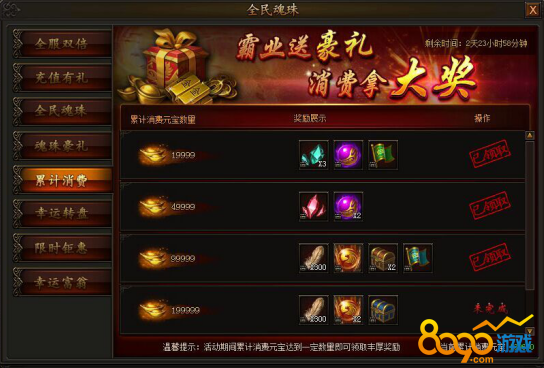 活动期间,累计消费一定数量元宝,即可领取对应档奖励,每个角色只能领取一次。
