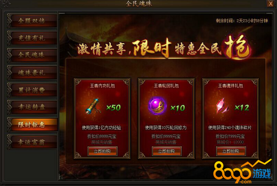 活动期间,内功、轮回和魂珠等材料礼包限时折扣,超低价格,不容错过!