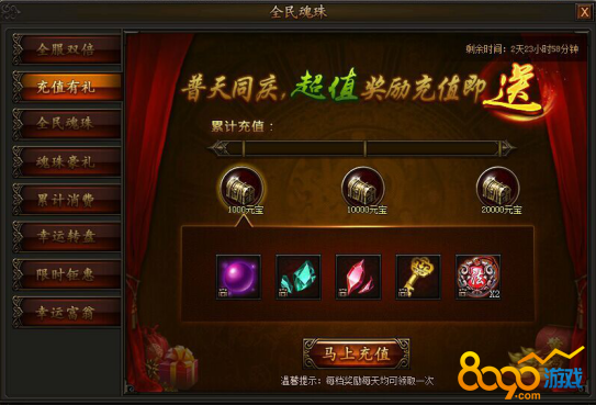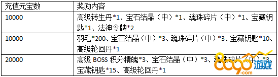 活动期间,充值元宝即可领取三档丰厚奖励,每天均可领取一次,不容错过!