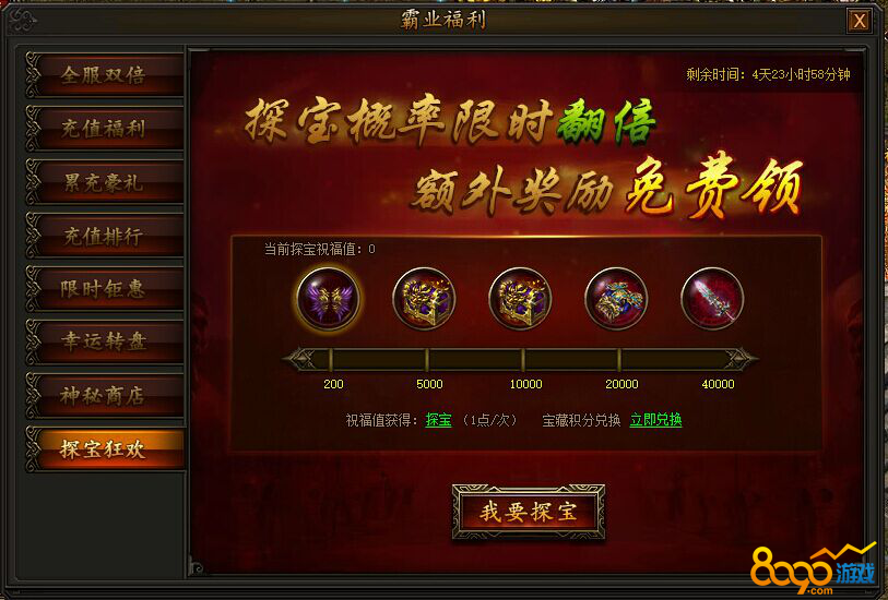 探宝超值回馈限时开启!活动期间探宝可获得祝福值,祝福值达到一定数值即可领取霸业装备奖励!