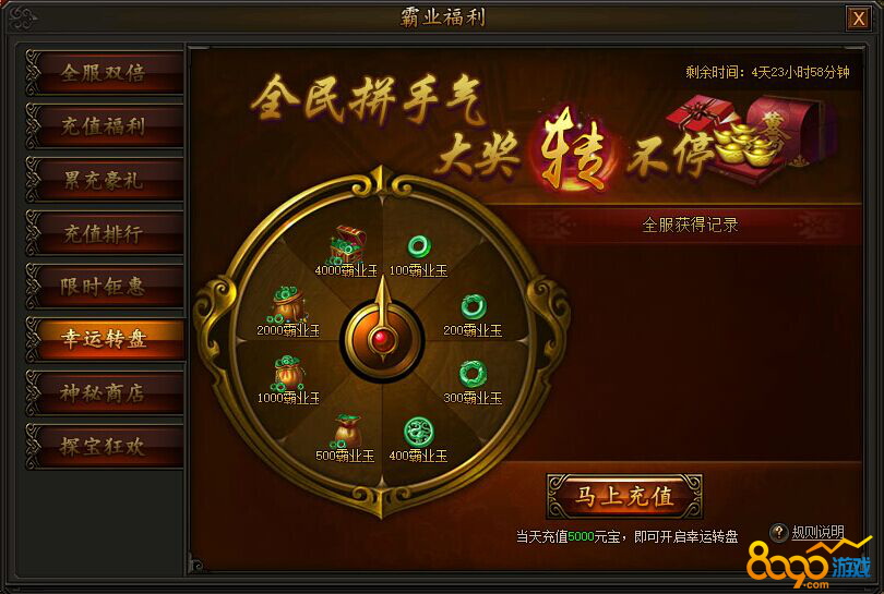 活动期间,充值并消费一定元宝即可使用幸运转盘,获得大量霸业玉道具,使用霸业玉后即可前往霸业商城内购买珍稀道具,精彩不容错过。