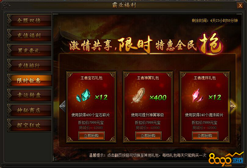 活动期间,宝石、羽毛、魂珠、成就、BOSS积分和血符等材料礼包限时折扣,超低价格,不容错过!
