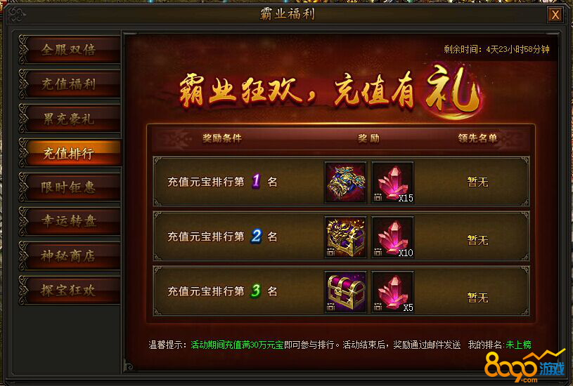 活动期间,累计充值元宝数满30w可参与排行,排行前三即可获得对应霸业装备和极品首饰奖励。