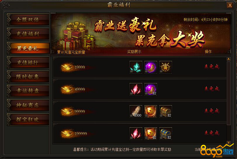 活动期间,累计充值一定数量元宝,即可领取对应档奖励,每个角色只能领取一次。