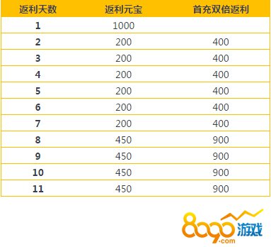 【活动内容】活动期间, 花费1000元宝,即刻获得1000元宝返利;每日还可再领返利,充值任意金额返利翻倍最高可获得7倍返利。