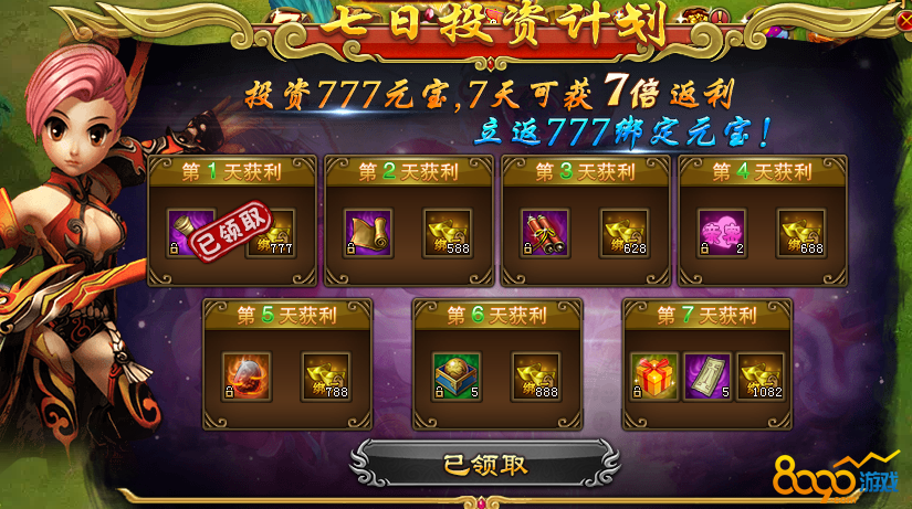 活动规则: 投资777元宝,7天可获得7倍的返利,每天可以领取相应的道具。