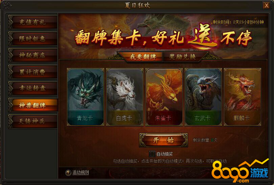 活动期间,每充值2000元宝,可获得一次翻牌机会,抽取一张卡片;集齐各类卡牌,可组合兑换不同档次的奖励。
