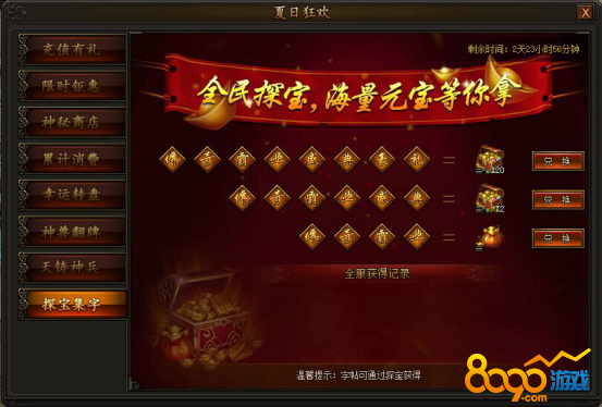 活动期间,探宝可能获得“传奇霸业盛典豪礼”字帖,集齐字帖可兑换海量不绑定元宝奖励!