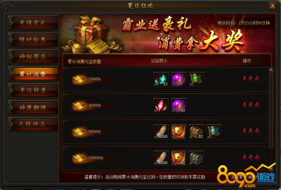 活动期间,累计消费一定数量元宝,即可领取对应档奖励,每个角色只能领取一次。
